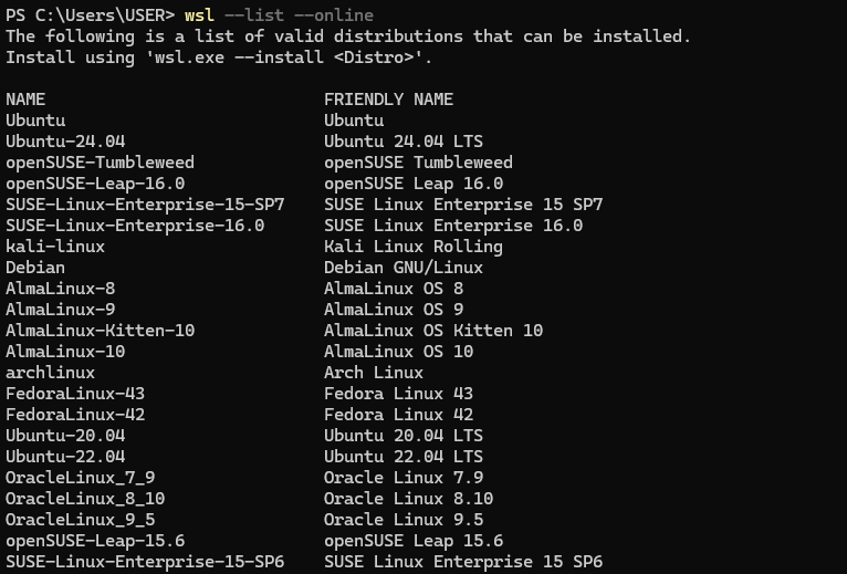 이후 파워셀에서 설치 가능한 WSL 옵션들을 뽑아옵니다.