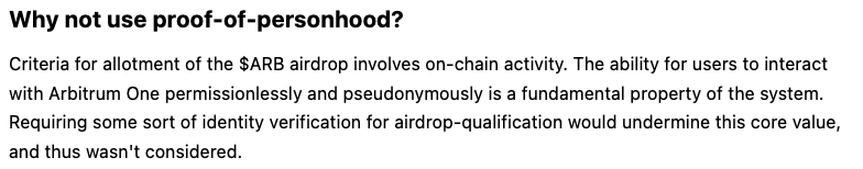 아비트럼은 이번에 BABT, Galxe Passport, Gitcoin Passport 등 여러 가지로 다계정을 막을 수 있는 방법이 있었지만, 시도하지 않았습니다.