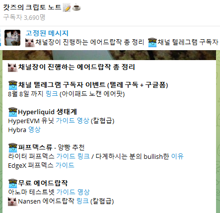👀채널장이 진행하는 에어드랍작 총 정리 🐈⬛채널 텔레그램 구독자 이벤트 (텔레 구독 + 구글폼) 8월 8일 까지 링크 (아이패드 노캔 에어팟) 🐈⬛Hyperliquid 생태계 HyperEVM 유닛 가이드 영상