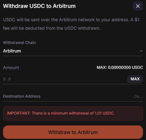 최소 입금 가능한 금액은 $5입니다 <ㅡㅡ> 반대로 출금은 Withdraw USDC를 원하시는 네트워크 선택 후 진행할 수 있습니다.
