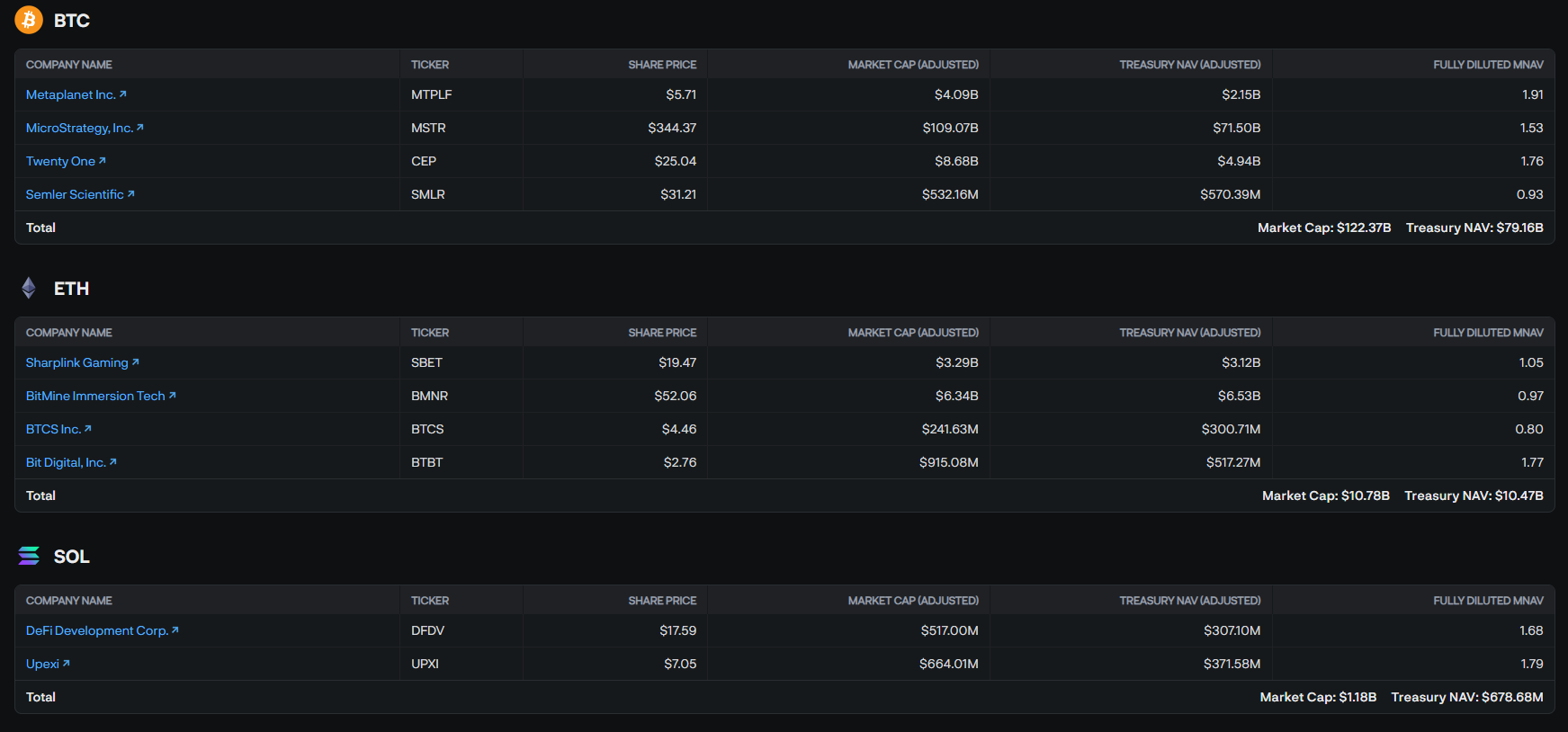 BTC, ETH, SOL 각각의 DAT 전략을 사용하는 회사들 티커와 mNAV 홀딩량까지 잘 정리되어 있는 문서가 있어서 공유해 드립니다.