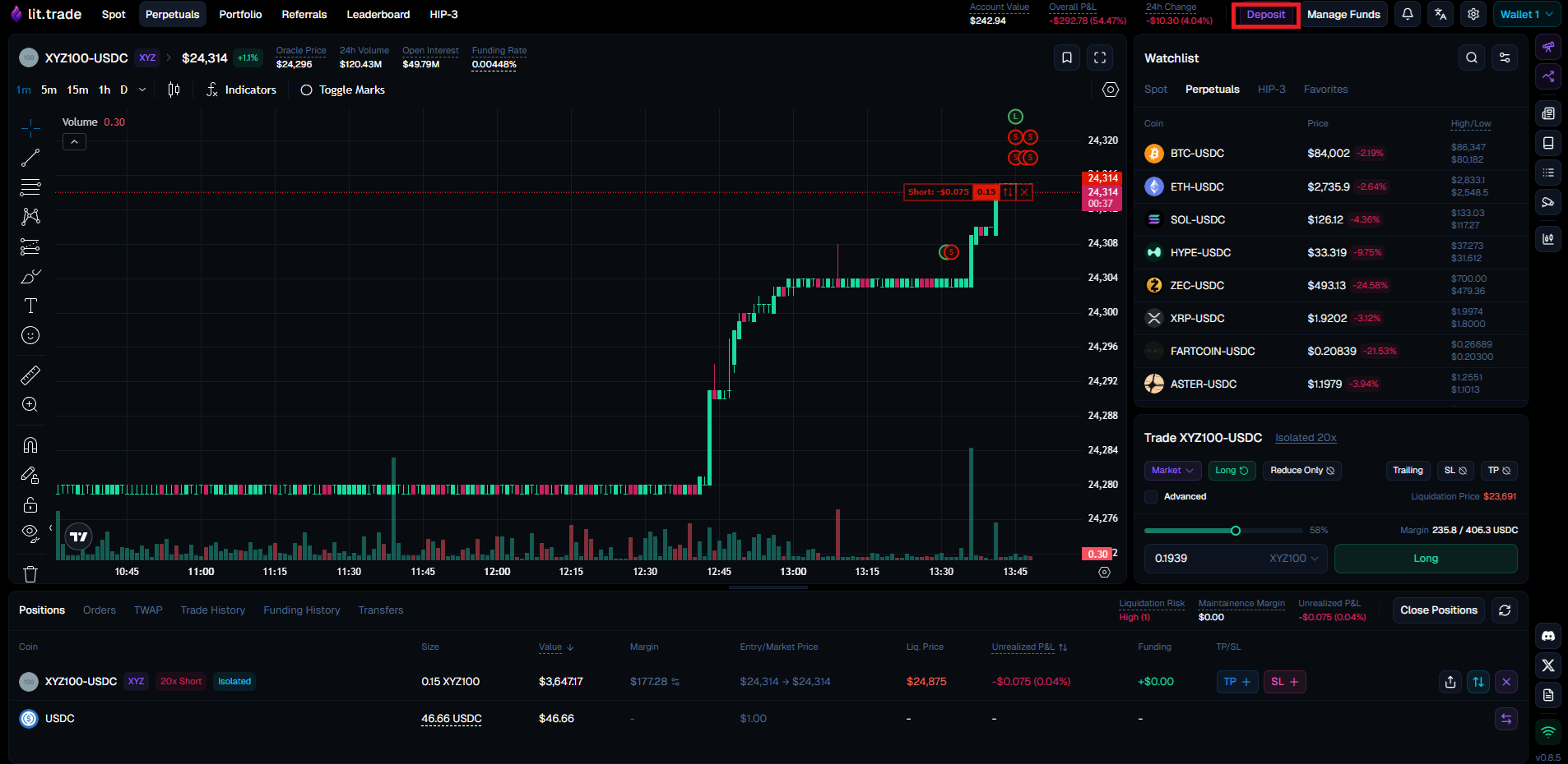 혹은 상단 코드를 적용한 Hyperliquid 본체에 Perp에 아비트럼 USDC를 입금해도 정상적으로 lit.trade Perp 잔고에도 반영이 될 것입니다. (추천)
