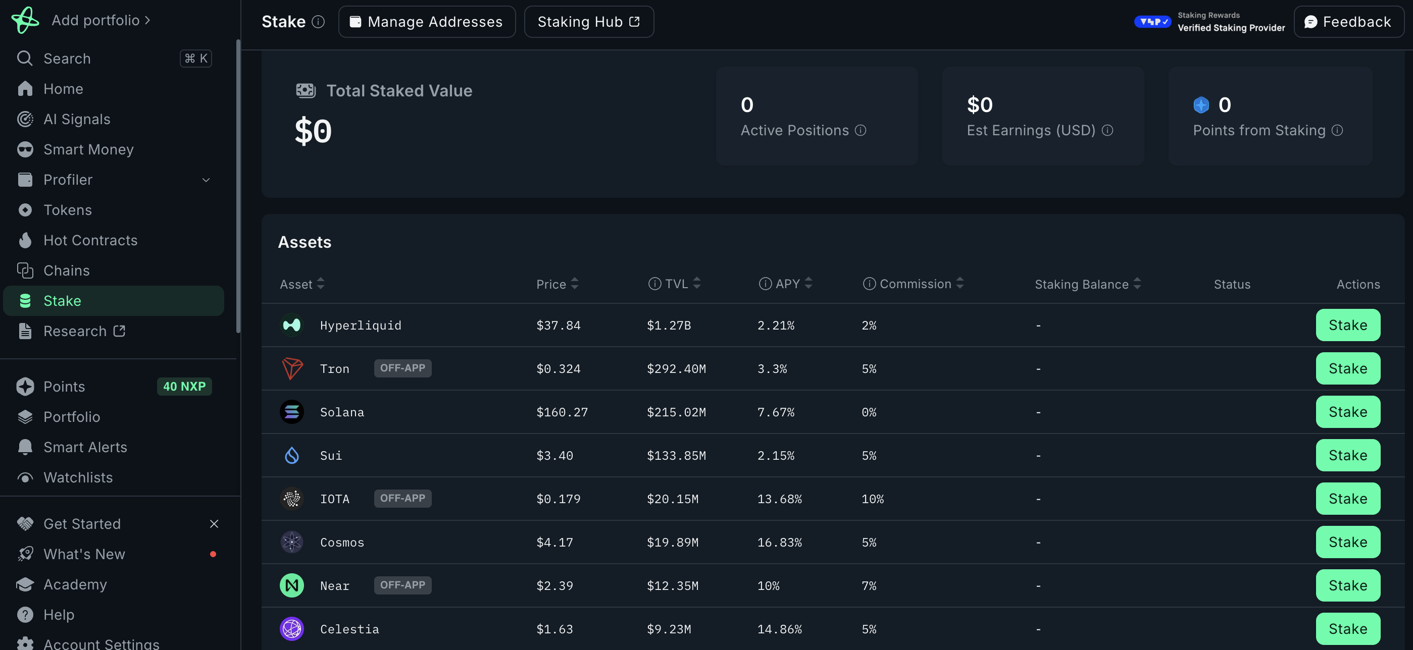 난센 스테이킹 페이지에 접속하면 스테이킹 가능한 자산 + 이자율을 확인할 수 있습니다.