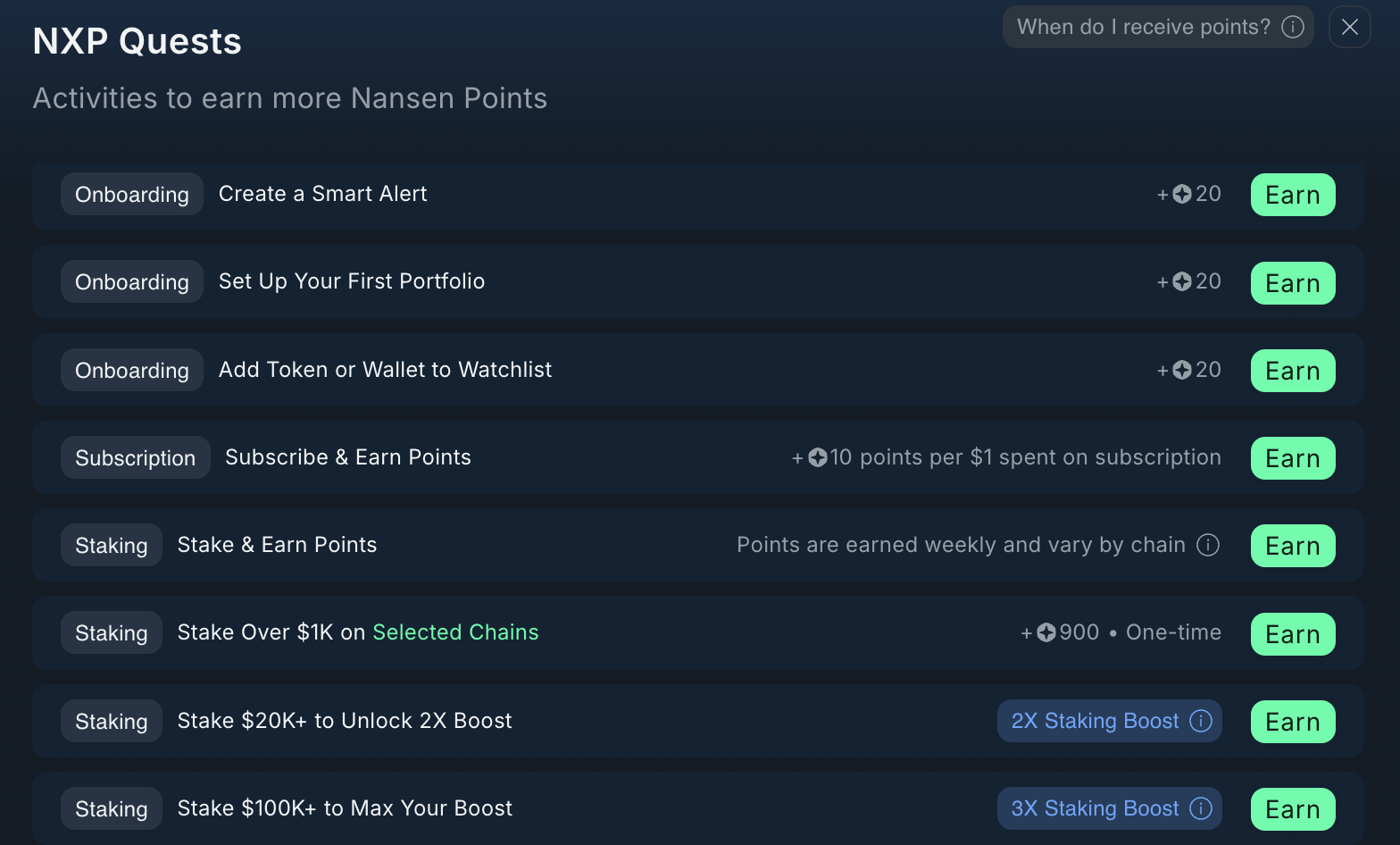 가성비가 좋은 미션은 첫 1회 한정 일부 선택된 체인 (HYPE, Sol, Sui, Avax 등)에서 $1000불 이상 스테이킹 시 900포인트를 적립해 줍니다 ($90불 구독으로 사용한 거와 동등한 가치의 포인트)