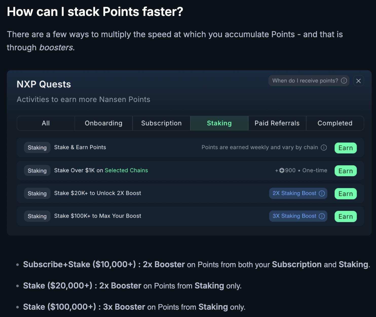 단독으로 스테이킹만 할 시에는 $20,000 이상 스테이킹 시 2배의 스테이킹 포인트 부스트를 주고 $100,000 이상 스테이킹시 3배의 스테이킹 포인트를 지급해 줍니다.