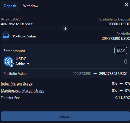 원하는 입금 수량을 아비트럼 네트워크 위에 있는 USDC 수량을 입력하고 Deposit 버튼을 누르면 5초 이내로 입금이 완료됩니다.