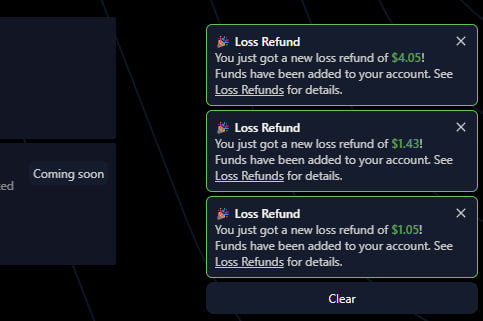 예시로 Silver 티어 기준 손실이 난 거래를 실현할 때 마다 1% 확률로 그 거래의 손해를 전액 환불해줍니다. 돌려받으면 이렇게 알림으로 표시해주고 바로 USDC로 입금해줍니다.