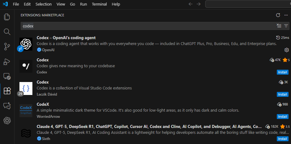 이후 마켓플레이스에서 Codex를 설치해 줍니다. 혹은 원하는 LLM이 있으면 그에 맞는 확장프로그램을 세팅하고 구독권이든 크레딧 잔액이든 세팅해 줍니다