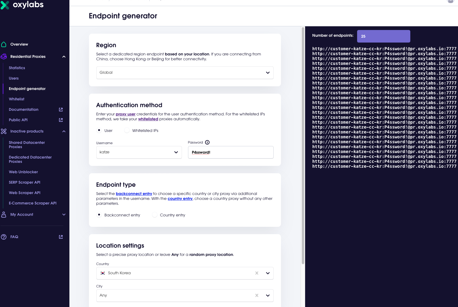 Whitelist로 본인 IP를 등록하면 조금 더 편리합니다. ID:PW 필요 없음 예시 "http://kr-pr.oxylabs.io:30000"