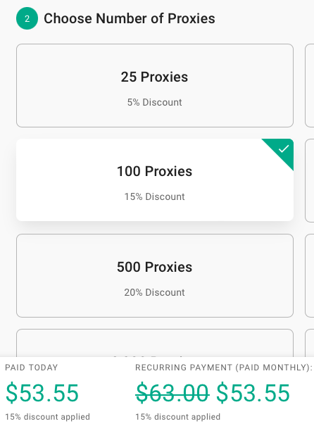 판매자가 0~2명에게 공유하는 프록시 100개는 $53.55에 판매하고 있습니다.