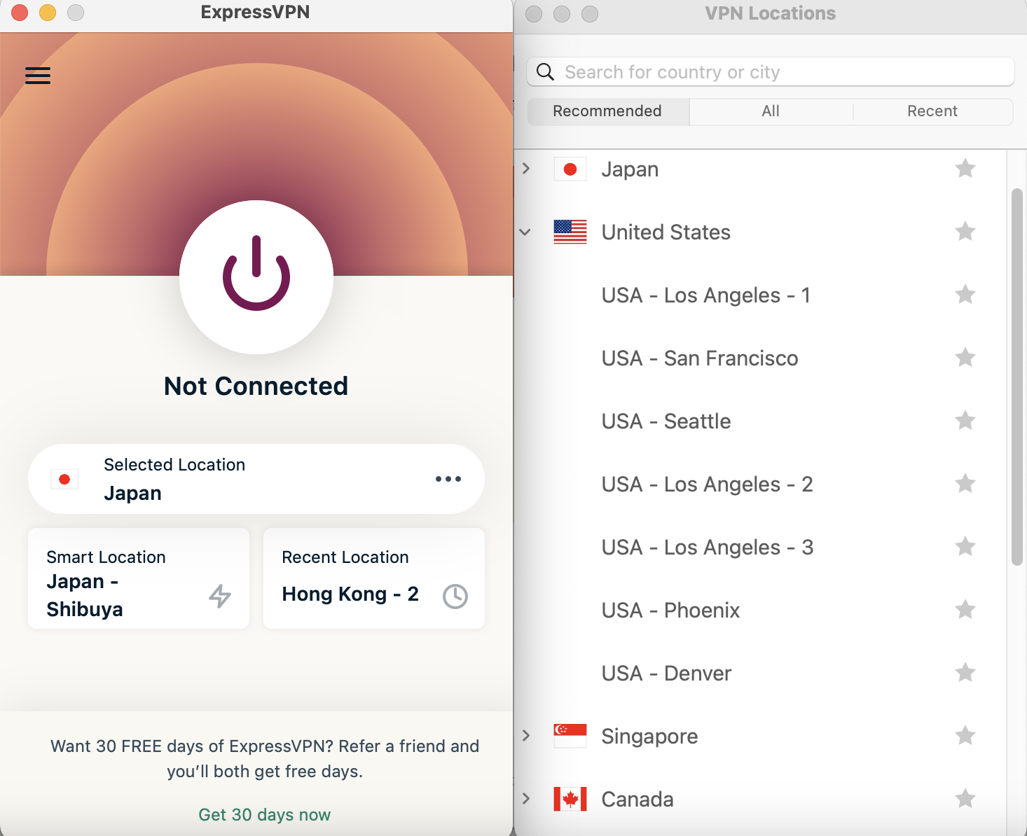VPN 중에서도 저는 제일 유명한 회사 중 하나인 Express vpn과 Nord VPN을 사용하는데 좌측 익스프레스 vpn을 살펴보면, 미국 서버 중 선택할 수 있는 옵션은 7개가 전부인데, 반면 NordVPN을 살펴보면 미국만 1793개의 독립적인 IP주소를 고를 수 있습니다.