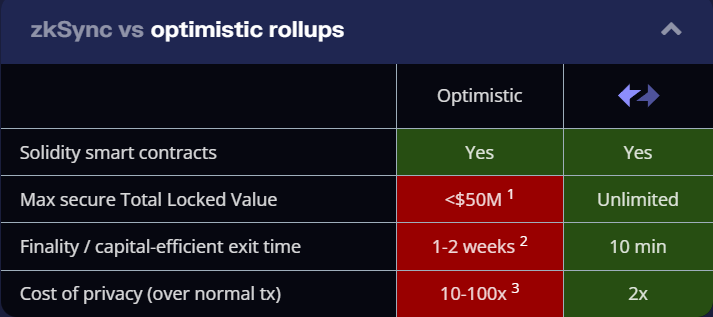 옵티미스틱 롤업은 최대 보호된 락업 예치금액의 상한선이 있지만 반면 영지식 롤업을 사용하는 zkSync에서는 보호된 락업 예치 금액의 상한선이 없습니다.